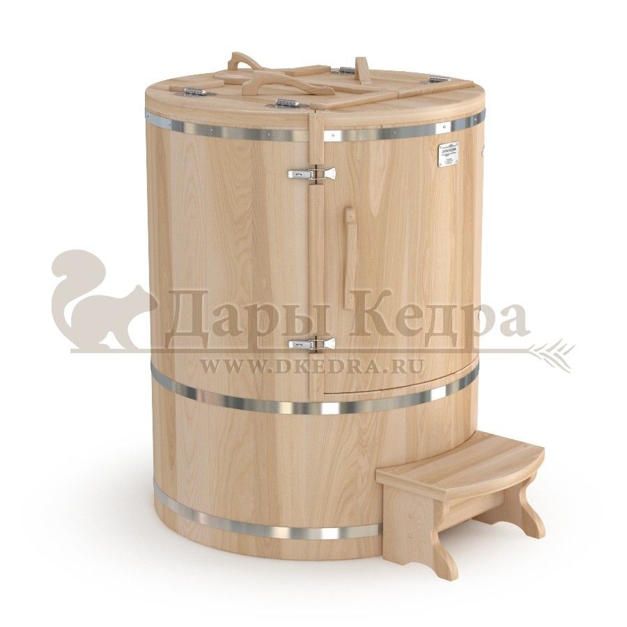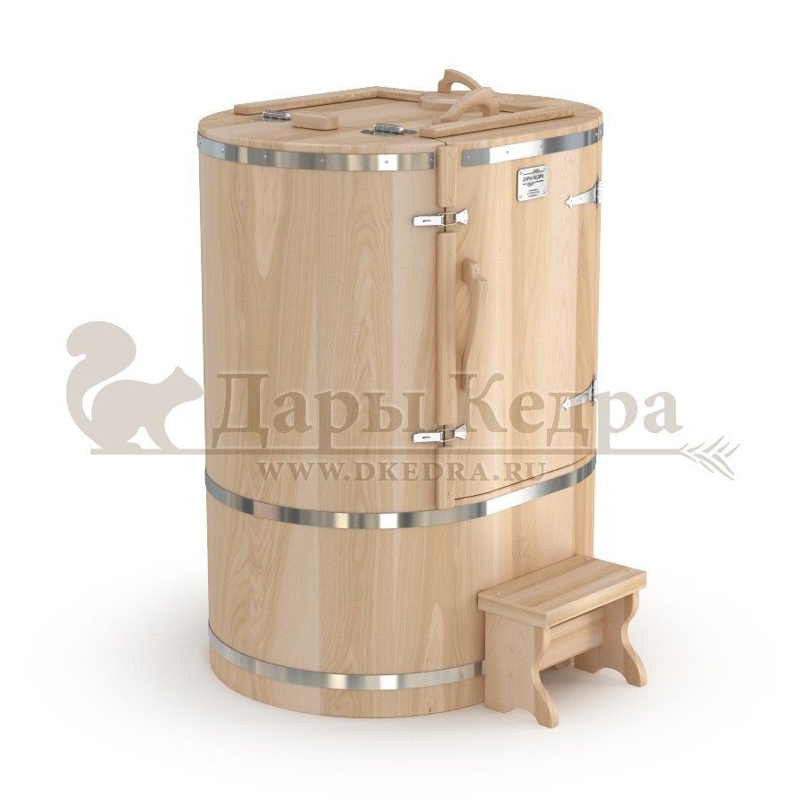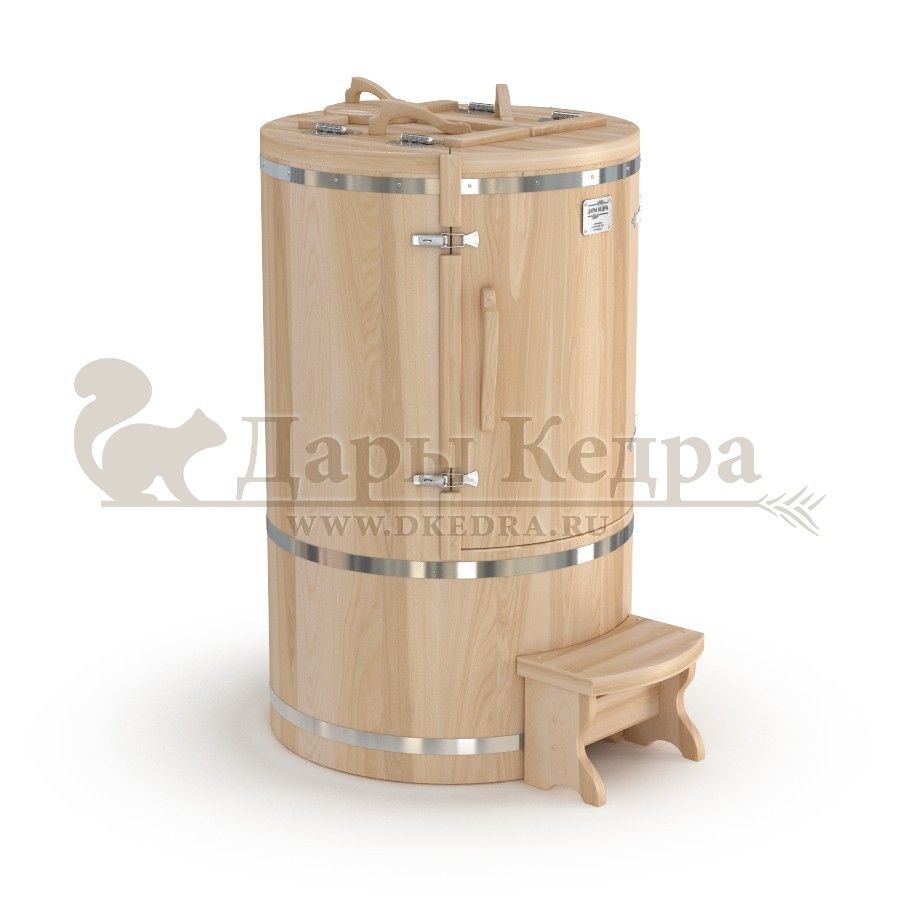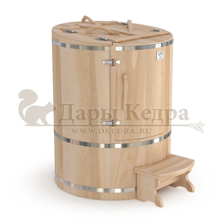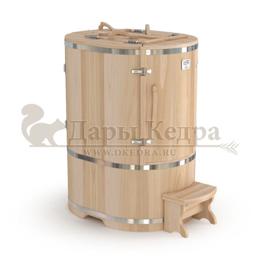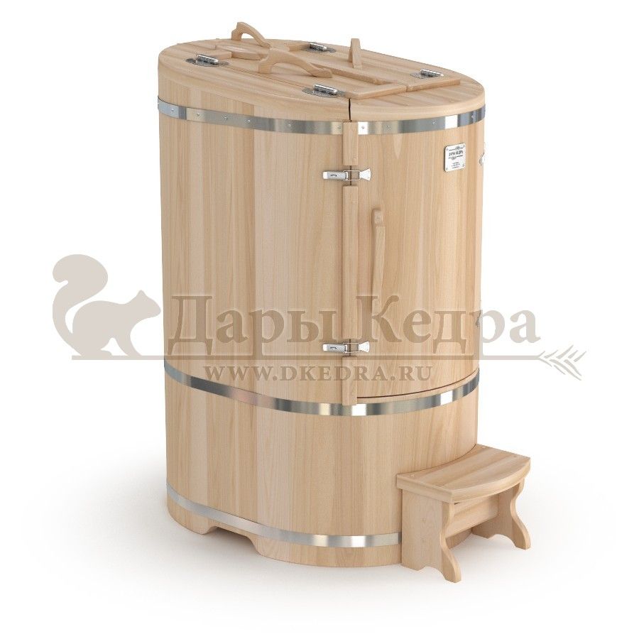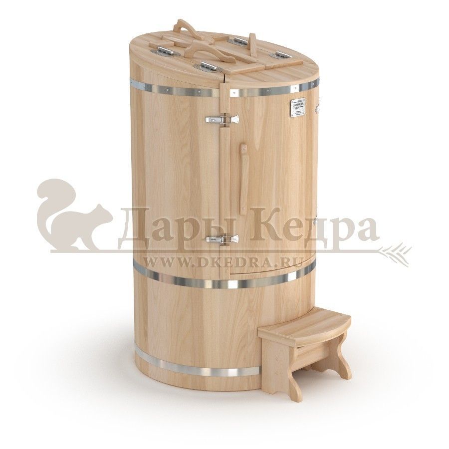 • Кедровая бочка (фитобочка) овальная со скосом «Профессиональная» Овальная фитобочка из кедра - это мини парная, которую можно использовать не только в спа-салонах, но и дома. Овальная модель более просторна и удобна в использовании. Толщина стенок составляет 40-45 мм, что позволяет увеличить срок службы изделия. Верхний скос делает положение головы более комфортным и улучшает обзор. Она оборудована откидными створками, дверцей и отверстием для головы. Во время парения человек сидит внутри кедровой бочки, а голова находится снаружи. Благодаря этому исключается возможность перегрева. Подлокотники из кедра, встроенные ручки на створках и двери делают эксплуатацию более удобной. Парение в фитобочке благотворно влияет на организм в целом: повышается иммунитет, выводятся шлаки и токсины, улучшается работа органов тела и состояние кожи.