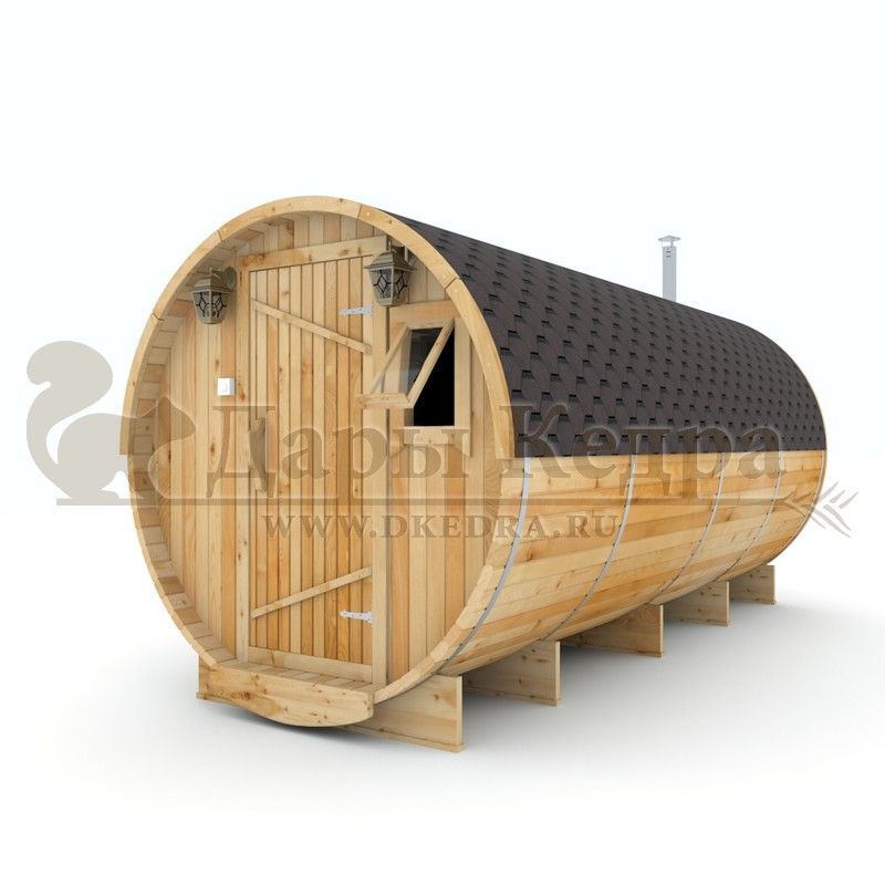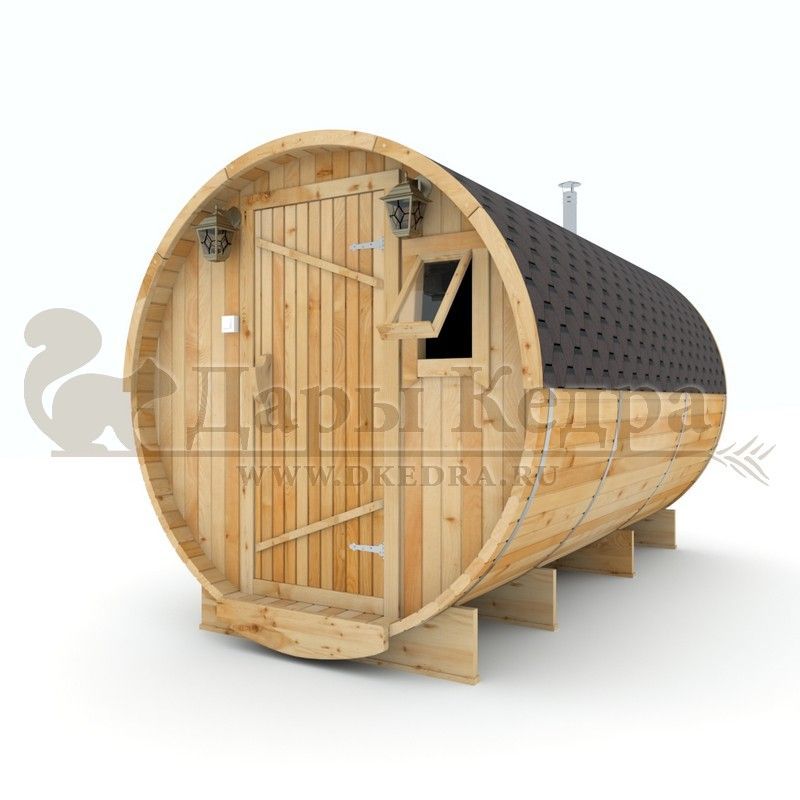 Баня-бочка буханка из кедра с козырьком (все размеры) Баня-буханка более просторная за счет увеличенной высоты потолков и ровного пола. Козырек не только украшает баню, но и защищает оставленную обувь от дождя. Лавочки из кедра находятся по всей длине бани-бочки с обеих сторон. Печь расположена в парилке около дальней стены. Время растопки такой бани не превышает 30 минут. В зависимости от выбранного размера баня-бочка буханка с козырьком имеет следующую комплектацию: Баня-бочка буханка 2,5 метра - парилка; Баня-бочка буханка 3,5 и 4,5 метра - раздевалка, парилка; Баня-бочка буханка 5,5 метров - раздевалка, парилка, моечная. По вашему желанию ее можно укомплектовать печью с внешней загрузкой, благодаря которой весь мусор вовремя топки остается на улице. Баня-бочка буханка не требует полноценный фундамент, поэтому при необходимости ее можно перенести в другое место. Обращаем Ваше внимание, что в стандартную комплектацию бани входят полки открытого типа в парной с обеих сторон. Дополнительно можно заказать полок закрытого типа или лавку! Кедр обладает ароматическими свойствами. Он не деформируется и влагоустойчив, при правильном уходе за деревом на нем не развиваются грибки и плесень.
