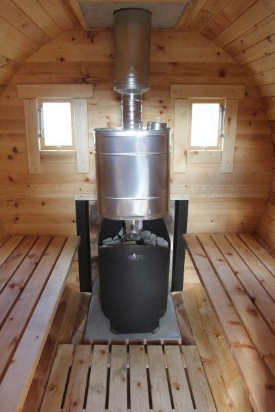 Баня-буханка более просторная за счет увеличенной высоты потолков и ровного пола. Козырек не только украшает баню, но и защищает оставленную обувь от дождя. Лавочки из кедра находятся по всей длине бани-бочки с обеих сторон. Печь расположена в парилке около дальней стены. Время растопки такой бани не превышает 30 минут. В зависимости от выбранного размера баня-бочка буханка с козырьком имеет следующую комплектацию: