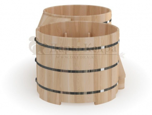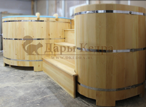 Двойная купель из кедра чаще всего используется в крупных банных комплексах и оздоровительных центрах. Она представляет собой две круглые чаши для воды, в которых люди отдыхают после парения. Между купелями установлен широкий подиум из кедра, по которому могут спускаться и подниматься сразу несколько людей. Для комфортного отдыха купель оснащена лавочками и двумя дополнительными лестницами. За счет стяжных болтов обручи из нержавеющей стали плотно прилегают к кедровой купели. Это позволяет равномерно распределять нагрузку воды и сохранить форму изделия в период эксплуатации. При правильном уходе купель для бани не рассыхается и не подвергается гниению.