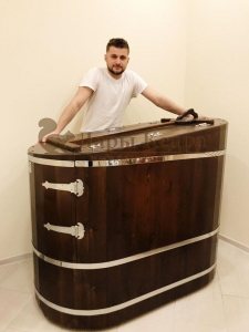 Кедровая фитобочка полулежачая - это мини парная, которую можно использовать не только в спа-салонах, но и дома. Модель этой бочки наиболее комфортна, так как позволяет принимать процедуры полулежа. Толщина стенок составляет 40-45 мм, что позволяет увеличить срок службы изделия. Фитобочка оборудована откидными створками, дверцей и отверстием для головы. Во время парения человек находится внутри кедровой бочки, а голова снаружи. Благодаря этому исключается возможность перегрева. Подлокотники, подспинник из кедра и внутренние ручки делают эксплуатацию фитобочки более удобной.