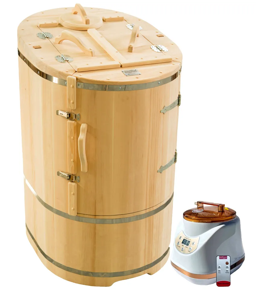 Готовый комплект «Доступный»: кедровая бочка с парогенератором Готовый комплект - это полностью укомплектованный набор с фитобочкой для процедур парения. Круглая модель наиболее компактна и мобильна. Толщина стенок составляет 25 мм. Фитобочка оборудована откидными створками, дверцей и отверстием для головы. Во время парения человек сидит внутри кедровой бочки, а голова находится снаружи. Благодаря этому исключается возможность перегрева. Подлокотники из кедра, встроенные ручки на створках и двери делают эксплуатацию более удобной. Парение в фитобочке благотворно влияет на организм в целом: повышается иммунитет, выводятся шлаки и токсины, улучшается работа органов тела и состояние кожи.