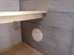 • Внутренняя обшивка: стены – евровагонка штиль, пол – доска шпунт или ламинат (на выбор). Обработка древесины защитным средством. Цвет – стены - белый лиссирующий, торцы и пол – серый лиссирующий.